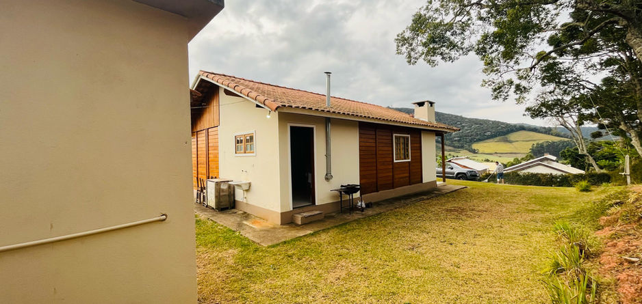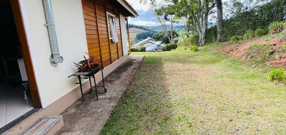Possui charmosa casa de madeira com 2 quartos, sala, cozinha americana, lareira, banheiro e varanda